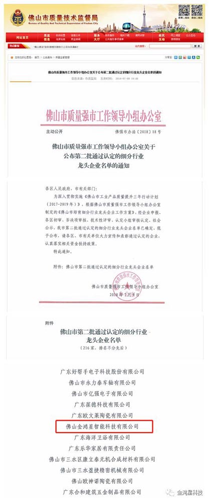 近日,佛山市質(zhì)量強(qiáng)市工作領(lǐng)導(dǎo)小組辦公室公示了“細(xì)分行業(yè)龍頭企業(yè)”入選名單。這是佛山金鴻星智能科技有限公司繼“國(guó)家高新技術(shù)企業(yè)”、“廣東省守合同重信用企業(yè)”之后獲得的又一項(xiàng)重大榮譽(yù)!