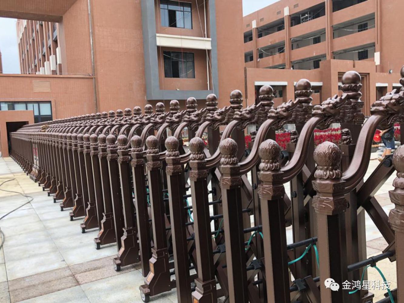 金鴻星龍韻393A以中國(guó)特有龍的形式,通過(guò)復(fù)雜多變的工藝結(jié)構(gòu)造型,將中國(guó)人的龍文化理念容入到現(xiàn)代伸縮大門的產(chǎn)品中,讓建筑大門彰顯濃郁的中國(guó)式的千年文化傳承,提升整個(gè)校區(qū)的中國(guó)元素。